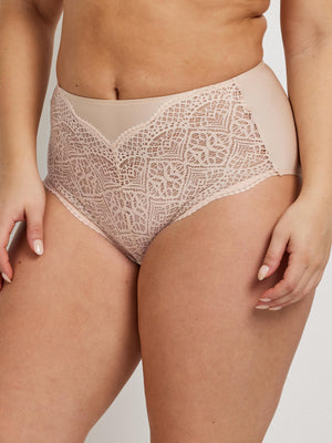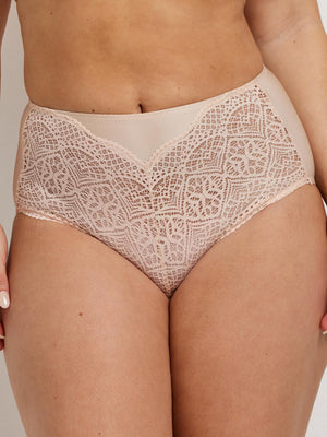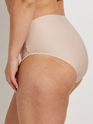 The Kayser Daily Essentials Micro & Lace Briefs in Honey are the ultimate everyday nude control knickers. Featuring a lacy waist detail in our new geometric lace and micro back and body, these full-coverage knickers will provide the ultimate support and comfort for everyday wear. Made from a smoothing, delicate floral lace these knickers are fashionable and functional.