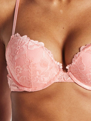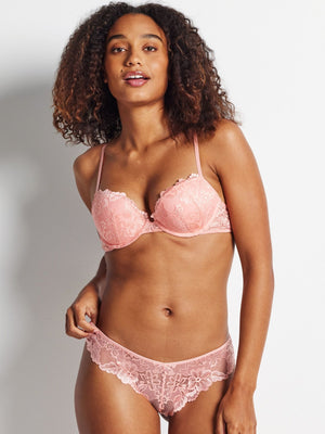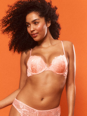 The Kayser Brazilian Push-up Bra in Candlelight Peach is a moulded cup lace bra with an added boost to lift and enhance the bust. Featuring all-over signature Brazilian lace, this peach push-up bra is the perfect bra for everyday or special occasions.