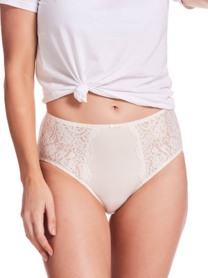 The Daily Essentials Stretch Cotton & Lace Full Brief in Ivory is a great option for everyday wear. These full-coverage panties have lace side panels and a breathable cotton body for all-day comfort. With a wonderful bow accent and bold lace, this knicker is both stylish and functional.