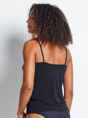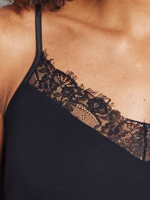 The V-Neck Lace Trim Cami in Black proves basics don’t have to be boring. In buttery-soft knit with a relaxed drape, scalloped lace trim along the neckline and satin straps, it’s both comfortable and effortlessly feminine. Layer it for day, dress it up for night, or wear it just because.