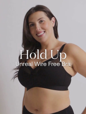 No wires. No digging. No compromise. Our NEW Hold Up Unreal Wirefree Bra in Black is all about softness and support. Designed for D-G Cups, it features shaped cups and a wide, plush band that holds you gently and stays comfortably in place. Sheer mesh panels give it that little extra something, while wide straps and a smooth back offer support that stays put all day. It’s the kind of bra you forget you're wearing… until someone asks where you got it.