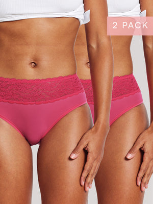 Bundle & save. Your favourite Glowlights Hi-Rise is now in a 2 pack. Bold yet beautifully soft pop of pink. The Glowlights Hi-Rise brief in Fruit Dove smooths and supports in all the right places, thanks to buttery 4-way stretch microfibre and a wide lace waistband that won’t roll or dig. Designed to hug your curves and stay put, it’s your go-to for all-day comfort with a little extra coverage.