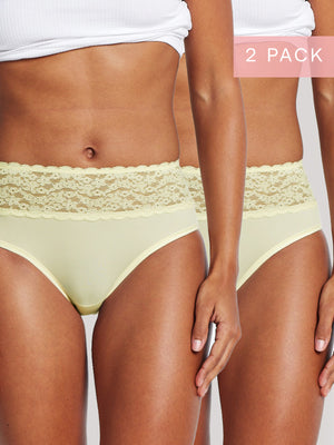 Bundle & save. Your favourite Glowlights Hi-rise is now in a 2 pack. Soft, sweet and a little zesty, this bikini brightens your top drawer. The Glowlights Hi-Rise brief in Lemon Icing smooths and supports in all the right places, thanks to buttery 4-way stretch microfibre and a wide lace waistband that won’t roll or dig. Designed to hug your curves and stay put, it’s your go-to for all-day comfort with a little extra coverage.