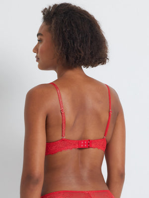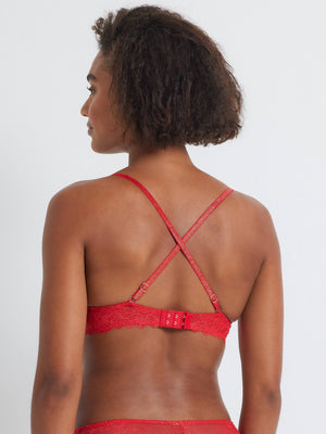 The Kayser Bombshell Super Boost Bra in Salsa creates maximum cleavage with a double-boosted padded bra that adds 2 sizes. This red push-up bra features a plunging neckline, adjustable straps and lacewings.