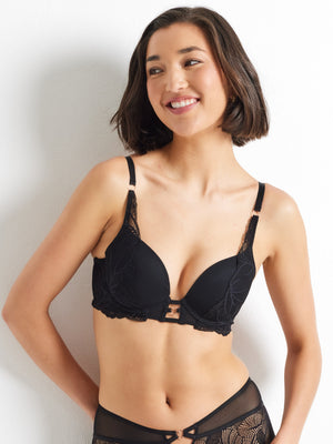 Turn up the heat with the After Dark Out All Night Push-Up Bra in Black. This sleek and sultry design combines comfort and confidence with a touch of glamour. The push-up style with soft, moulded cups creates the perfect lift while the longline frame adds a chic, flattering silhouette. The strap details between the cups adds a modern edge along with the gold love heart hardware for that extra luxe touch and the floral lace embroidery lends a romantic, feminine finish.