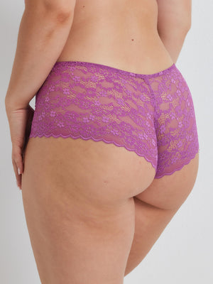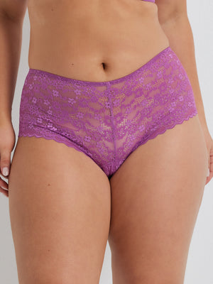 Pretty it up this season with our cheeky Be Free Lace Short in Hyper Violet. The best of both worlds, super comfy and super cute. This full-coverage knicker offers a blend of fashion and comfort, while the intricate lace detailing adds a touch of sophistication. The vibrant purple shade adds a touch of fun to your lingerie collection.