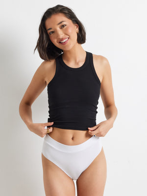 82% biodegradable, this Modal is an ultra-soft breathable fabric made from trees and is incredible at wicking moisture and keeping you feeling fresh and cool. This style has a cotton gusset for all-day cool comfort and breathability. This g-string has a wide supportive waistband, clean cut leg for a no-show finish, and no elastic, so it's compostable!