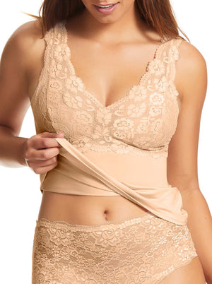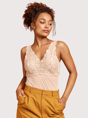 The Daily Essentials Helen Micro & Lace Cami in Honey is our most fashionable and functional singlet. Featuring a built-up lace bust line in our classic heritage corded floral lace and a flattering scoop back, this nude lace trim camisole top is perfect for layering and will keep you warm and supported all day long.