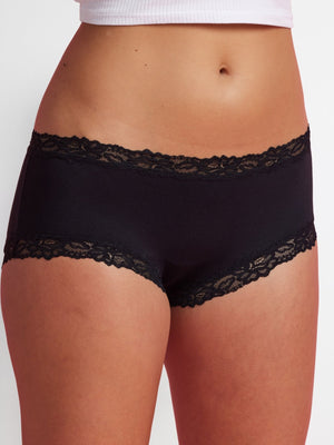 Oui oui to smooth, everyday chic. The Sukie Micro Boyleg in Black is your new silky favourite. Made from a soft, lightweight microfibre, this boyleg sits comfortably low on the hips and offers full-coverage support. Delicate lace trims along the waistband and legline make it a chic choice for days when you want comfort with a sleek, feminine finish.