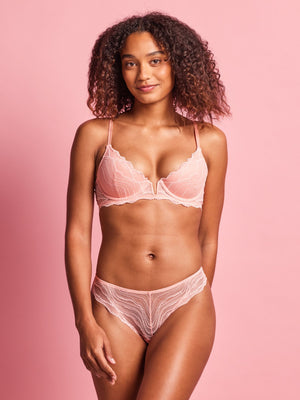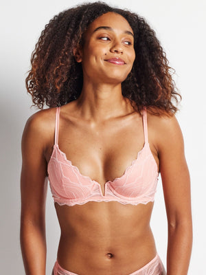 The Radiance V Wire Bra in Candlelight Peach is designed to shape, support and elevate your everyday. Featuring soft, moulded lace cups and a plunging V-front, this underwire bra offers a naturally lifted silhouette. Sheer embroidery adds subtle detail, while scalloped edges, mesh wings and gold hardware create a smooth, polished look. Comfortable enough for all-day wear yet refined enough for any occasion.